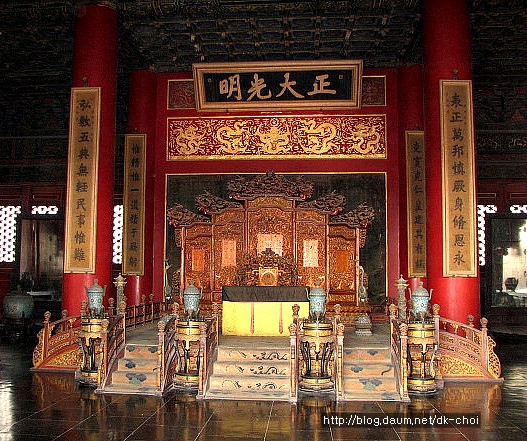 건청궁 내부 중앙에는 용을 새겨 넣은 보좌(寶座)가 단 위에 놓여있고, 그 앞의 책상은 황제가 정무를 보는 곳임을 나타내고 있습니다. 보좌 위로는 순치제가 썼다는 '정대광명(正大光明)'의 네 글자 편액이 있는데, 명대(明代)에는 '경천법조(敬天法祖, 하늘을 우러르고 황실의 법통을 받듬)'의 편액이 걸려있었다고 합니다.