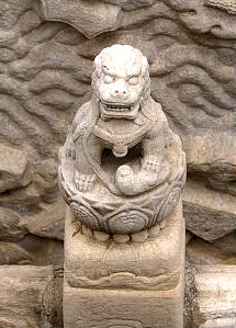 금전(金殿)은 문석대(文石臺) 위에 놓여있고 석대(石臺)를 포함한 금전의 높이는 3.5m이며, 석대(石臺)에는 해수(海水)와 강안(江岸)의 형상이 조각되어 있고, 기둥 머리에는 사자같은 석수(石兽)가 조각되어 앉아 있습니다.
